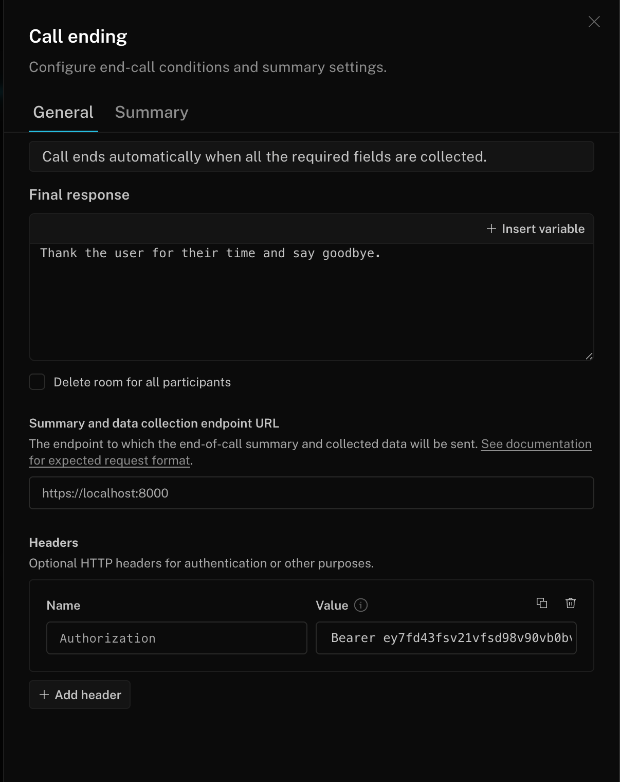 - Summary and data collection endpoint URL: The endpoint to which the end-of-call summary and collected data are sent via HTTP POST. See Endpoint payload below for the request format.
