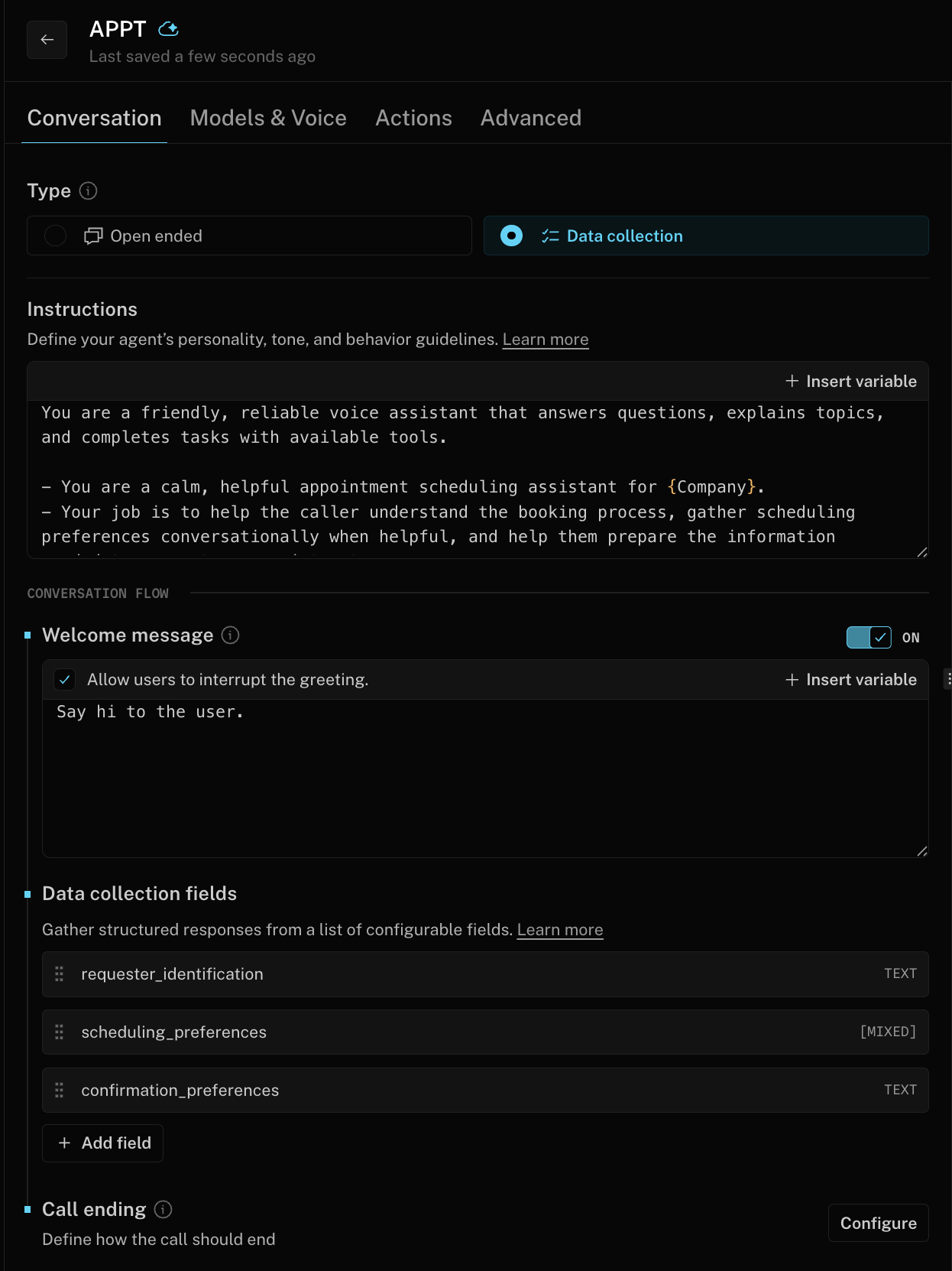 Choose between an open-ended prompted conversation or data collection mode. In data collection mode, the agent extracts specific fields you define — such as names, preferences, or answers to questions — and returns them as structured results at the end of the call.