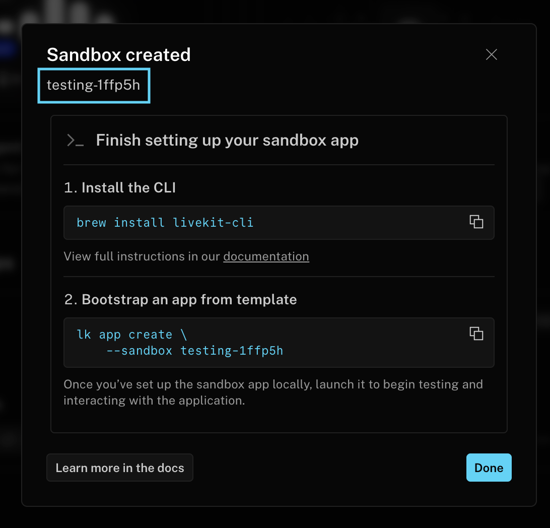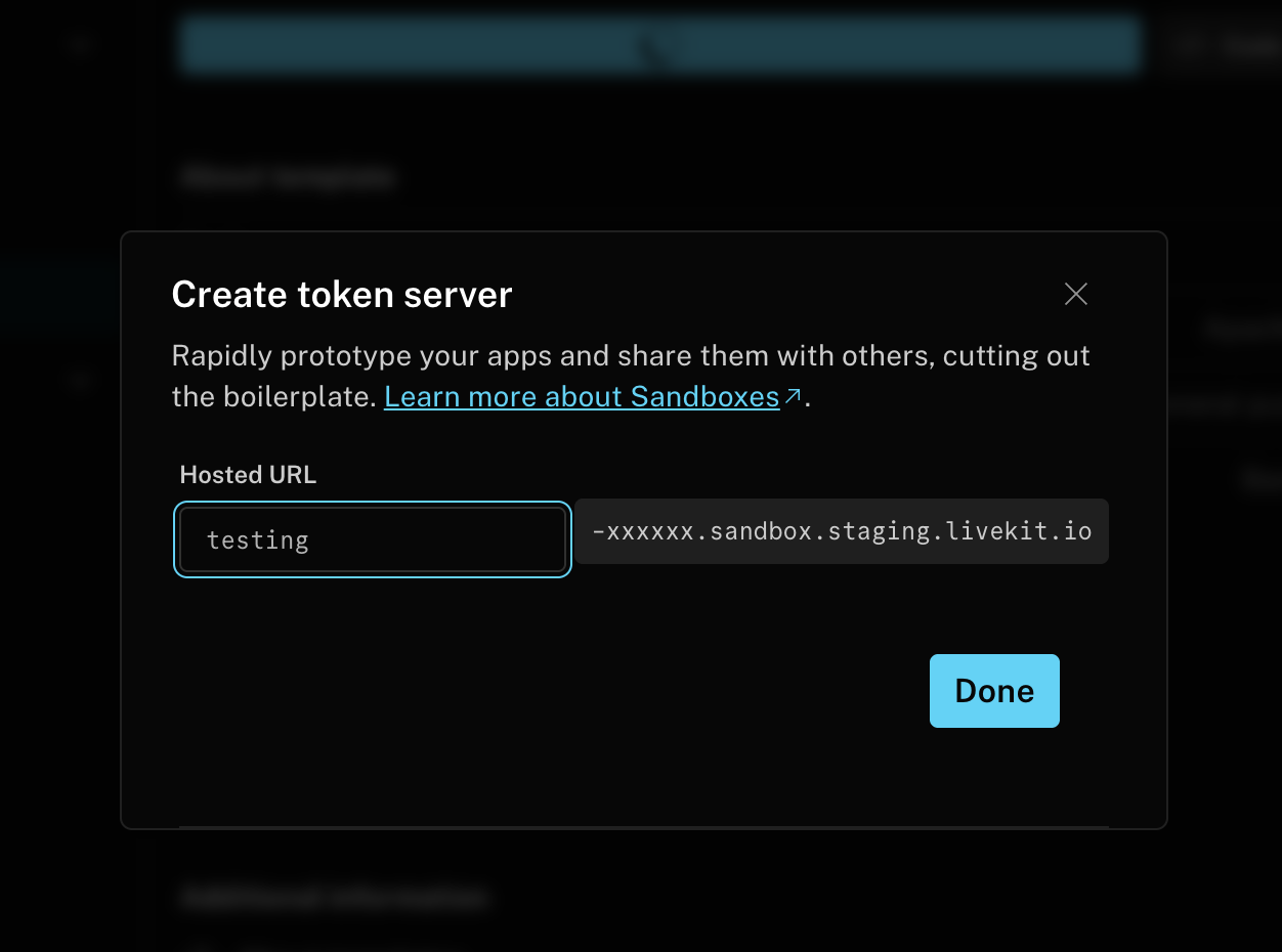 TokenSourcein your application to consume this sandbox ID:import { Room, TokenSource } from 'livekit-client';// Create the TokenSourceconst tokenSource = TokenSource.sandboxTokenServer({sandboxId: "<your sandbox token server id>",});// Fetch a token (cached and automatically refreshed as needed)const { serverUrl, participantToken } = await tokenSource.fetch({ roomName: "room name to join" });// Use the generated token to connect to a roomconst room = new Room();room.connect(serverUrl, participantToken);import { TokenSource } from 'livekit-client';import { useSession, SessionProvider } from '@livekit/components-react';// Create the TokenSourceconst tokenSource = TokenSource.sandboxTokenServer({sandboxId: "<your sandbox token server id>",});export const MyPage = () => {const session = useSession(tokenSource, { roomName: "room name to join" });// Start the session when the component mounts, and end the session when the component unmountsuseEffect(() => {session.start();return () => {session.end();};}, []);return (<SessionProvider session={session}><MyComponent /></SessionProvider>)}export const MyComponent = () => {// Access the session available via the context to build your app// ie, show a list of all camera tracks:const cameraTracks = useTracks([Track.Source.Camera], {onlySubscribed: true});return (<>{cameraTracks.map((trackReference) => {return (<VideoTrack {...trackReference} />)})}</>)}import LiveKitComponents@mainstruct SessionApp: App {let session = Session(tokenSource: SandboxTokenSource(id: "<your sandbox token server id>"))var body: some Scene {WindowGroup {ContentView().environmentObject(session).alert(session.error?.localizedDescription ?? "Error", isPresented: .constant(session.error != nil)) {Button(action: session.dismissError) { Text("OK") }}.alert(session.agent.error?.localizedDescription ?? "Error", isPresented: .constant(session.agent.error != nil)) {AsyncButton(action: session.end) { Text("OK") }}}}}struct ContentView: View {@EnvironmentObject var session: Session@State var message = ""var body: some View {if session.isConnected {AsyncButton(action: session.end) {Text("Disconnect")}Text(String(describing: session.agent.agentState))} else {AsyncButton(action: session.start) {Text("Connect")}}}}val tokenSource = remember {TokenSource.fromSandboxTokenServer("<your sandbox token server id>").cached()}val session = rememberSession(tokenSource = tokenSource)Column {SessionScope(session = session) { session ->val coroutineScope = rememberCoroutineScope()var shouldConnect by remember { mutableStateOf(false) }LaunchedEffect(shouldConnect) {if (shouldConnect) {val result = session.start()// Handle if the session fails to connect.if (result.isFailure) {Toast.makeText(context, "Error connecting to the session.", Toast.LENGTH_SHORT).show()shouldConnect = false}} else {session.end()}}Button(onClick = { shouldConnect = !shouldConnect }) {Text(if (shouldConnect) {"Disconnect"} else {"Connect"})}}}import 'package:livekit_client/livekit_client.dart' as sdk;final tokenSource = sdk.SandboxTokenSource(sandboxId: "<your sandbox token server id>");final session = sdk.Session.fromConfigurableTokenSource(tokenSource,const TokenRequestOptions());/* ... */await session.start();// Use session to further build out your application.import { TokenSource } from 'livekit-client';import { useSession, SessionProvider } from '@livekit/components-react';// Create the TokenSourceconst tokenSource = TokenSource.sandboxTokenServer({sandboxId: "<your sandbox token server id>",});export const MyPage = () => {const session = useSession(tokenSource, { roomName: "room name to join" });// Start the session when the component mounts, and end the session when the component unmountsuseEffect(() => {session.start();return () => {session.end();};}, []);return (<SessionProvider session={session}>{/* render the rest of your application here */}</SessionProvider>)}